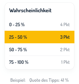 Je niedriger die Wahrscheinlichkeit ist, dass eine Mannschaft gewinnt, desto mehr Punkte erhältst du für die korrekte Vorhersage des Spielausgangs. Tippst du also auf den wahrscheinlichen Sieg des Favoriten gegen den Außenseiter, erhältst du bei korrekter Vorhersage weniger Punkte, als wenn du auf den Sieg des Außenseiters gegen den Favoriten tippst.