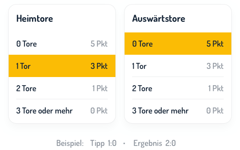 Je näher die von dir getippte Anzahl der Heim-/Auswärtstore an der Anzahl der tatsächlich gefallenen Heim-/Auswärtstoren dran ist, desto mehr Punkte erhältst du.